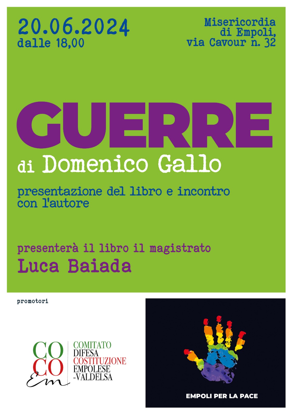 Nuova iniziativa del comitato ‘Empoli per la pace’ in collaborazione con il comitato difesa Costituzione Empolese-Valdelsa. Giovedì prossimo, 20 giugno, alle 18 la sala delle adunanze della Misericordia di Empoli ospiterà la presentazione del nuovo libro di Domenico Gallo dal titolo purtroppo attuale: Guerre.