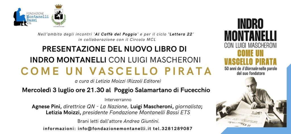 Per il ciclo 'Lettera 22' e a inaugurare gli incontri "Al Caffè del Poggio", mercoledì 3 luglio alle 21,30, al Poggio Salamartano di Fucecchio, presentazione del nuovo libro di Indro Montanelli "Come un vascello pirata" (Rizzoli), a cura di Letizia Moizzi con la prefazione di Luigi Mascheroni.