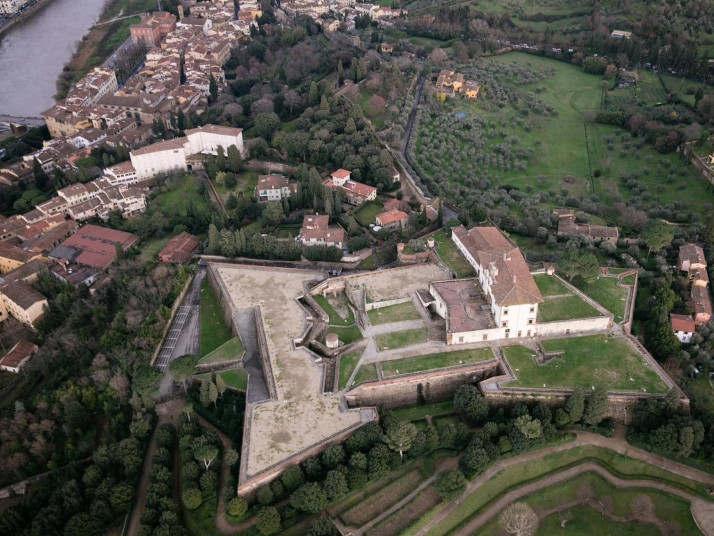 Il Forte di Santa Maria in San Giorgio conosciuto come Forte Belvedere è situato sul colle di Boboli, presso la porta cittadina di San Giorgio, fra le alture meridionali della città di Firenze, ed è fortemente correlato al territorio circostante. Il complesso che oggi vediamo è il frutto di un’articolata stratificazione architettonica, che si innesta nelle adiacenze del circuito murario medievale per trovare la sua definizione negli ultimi anni del XVI secolo. Il Forte, la cui palazzina è attribuita a Bartolomeo Ammannati, è situato infatti in prossimità della cinta delle mura cittadine arnolfiane (1285-1333), che già nei primi decenni del Cinquecento rivela la propria inadeguatezza, in particolare su quel versante della città e che intorno alla metà del secolo, su impulso di Cosimo I de’ Medici, porterà a una revisione del sistema difensivo. Il Forte Belvedere risponde alle esigenze difensive sul fronte sud della città in caso di attacchi esterni e anche di controllo e dominio sulla città, nonché a rifugio in caso di pericoli ed epidemie. Il nuovo forte viene incastonato fra le cortine della cinta muraria trecentesca, la sua posizione elevata rispetto alla città garantisce difesa e protezione e offre opportunità di controllo sul nucleo urbano, la localizzazione in prossimità della residenza di Pitti agevola il rifugio in caso di sommossa e i suoi sotterranei conservano segretamente le ricchezze del tesoro mediceo. Rifugio contro rovesci politici ma anche contro gli inevitabili flagelli sanitari che spesso si abbattevano su Firenze.