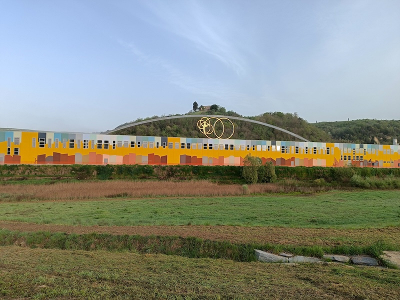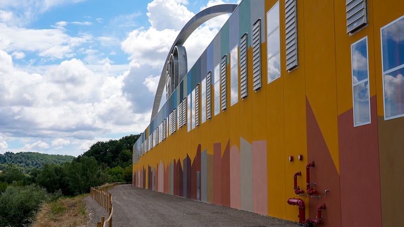 Con l’obiettivo di valorizzare l’inserimento del nuovo impianto nel bellissimo contesto delle colline dell’Alta Valdera si è scelto di utilizzare i capannoni come base per due opere d’arte di artisti di fama internazionale. Il capannone del compostaggio da 12.000 metri quadri ospita sulla copertura l’opera ‘Germoglio’ dell’artista Remo Salvadori: il fiore della vita, a cui si allude, è un simbolo del germoglio che nasce dal caos per poi creare una trasformazione. Sempre sul capannone del compostaggio, ma sulla facciata lunga oltre 200 metri, l’artista David Tremlet ha realizzato l’opera pittorica ‘Untitled’ partendo da una griglia geometrica e intersecata a una sequenza di forme astratte regolate e distribuite sulle superfici secondo criteri in cui predomina l’attenzione alla proporzione e ai rapporti spaziali che nascono dalla loro combinazione e assemblaggio. I colori selezionati dall’artista, l’ocra, il rosa, il marrone e le diverse gradazioni di grigio, rimandano alle colline circostanti, fattore determinante e fonte di ispirazione per il concepimento di una nuova opera da realizzarsi intorno a Peccioli.