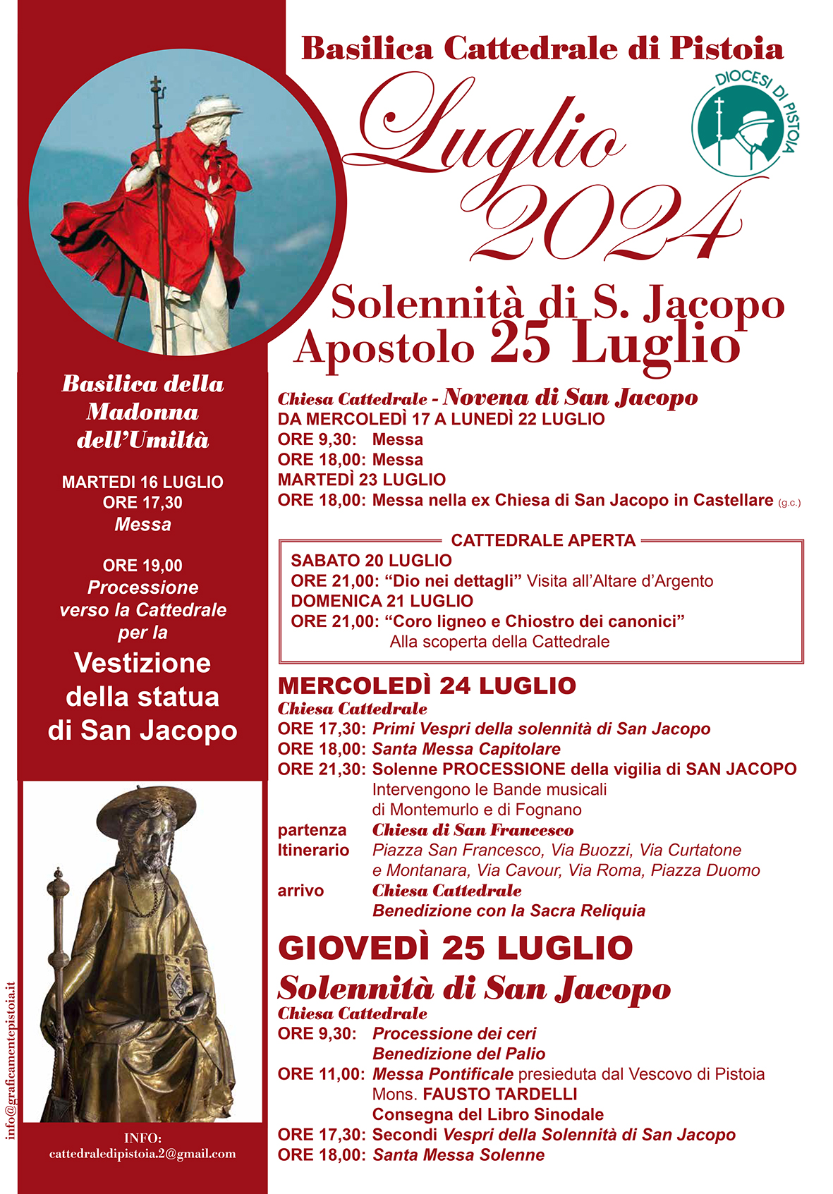 Un programma ricco quello dei festeggiamenti iacobei che vedranno, nel giorno di giovedì 25 luglio, anche la consegna del testo definitivo del XX Sinodo della Diocesi di Pistoia da parte del Vescovo di Pistoia e Pescia, mons. Fausto Tardelli.