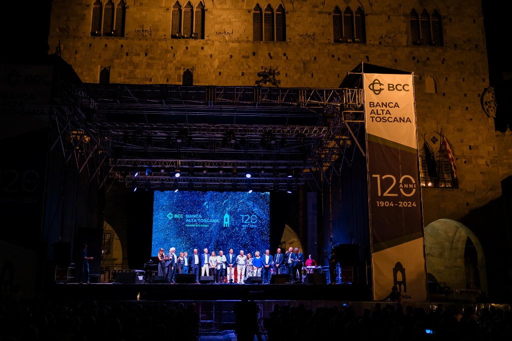 Una serata di festa, con musica dal vivo, teatro e divertimento nella splendida cornice di piazza Duomo a Pistoia. È il regalo che Banca Alta Toscana Credito Cooperativo ha fatto ai propri soci per festeggiare il traguardo dei 120 anni di fondazione, che ricorre in questo 2024. Oltre 3.000 i soci che martedi 9 luglio hanno risposto all’appello ed hanno assistito dal vivo allo spettacolo, condotto da Stefano Baragli e Serena Magnanensi. I soci della Bcc che non hanno potuto essere presenti in piazza Duomo, sono stati invitati a seguire l’evento in diretta streaming.