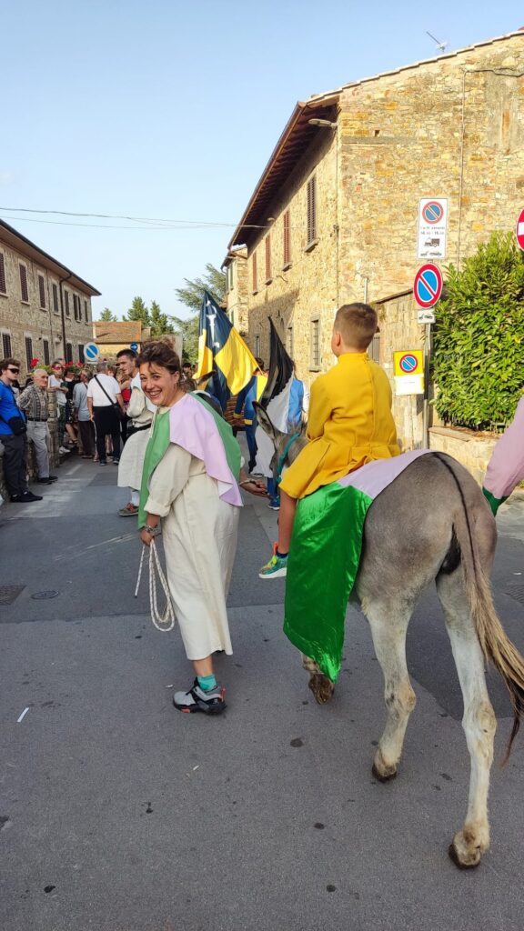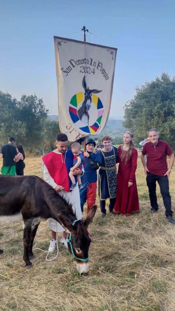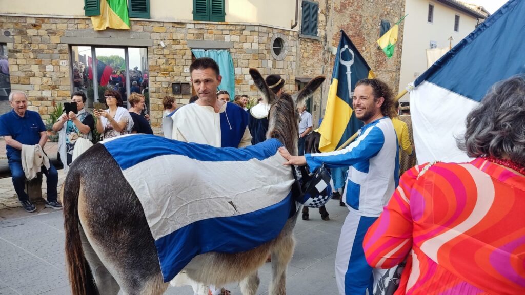 È stata una gara avvincente, caratterizzata da inaspettati colpi di scena e spassose gag, che ha alternato ciuchini ribelli, persino in fuga, inseguiti dai loro fantini pieni di aspettative ed entusiasmo che non si sono fatti mancare nulla, compreso qualche capitombolo o ruzzolone sul campo ricoperto di fieno. Ma tutto è filato liscio: nelle due batterie della corsa che si è tenuta nel parco della pieve di San Donato Poggio, in una pista a forma di L, lungo un tratto di oltre 100 metri, ha furoreggiato l’abilità di Edoardo Cini che, nonostante fosse alla sua prima esperienza del Palio, ha guidato Lisa con grande destrezza e sbaragliato la concorrenza.