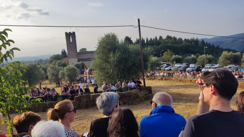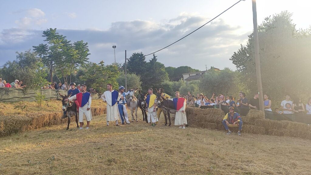 Nel campo della Pieve, chiamato ironicamente dagli abitanti ‘Ciucodromo’, si sono sfidate al galoppo veloce ma non troppo sei contrade: via Senese, via dei Fossi, via dei Baluardi, via del Giglio, via della Madonna e piazza Malaspina, le stesse vie del paese dove in epoca medievale, secondo un’antica leggenda ai confini con la verità storica, si verificò il ratto delle sandonatine.