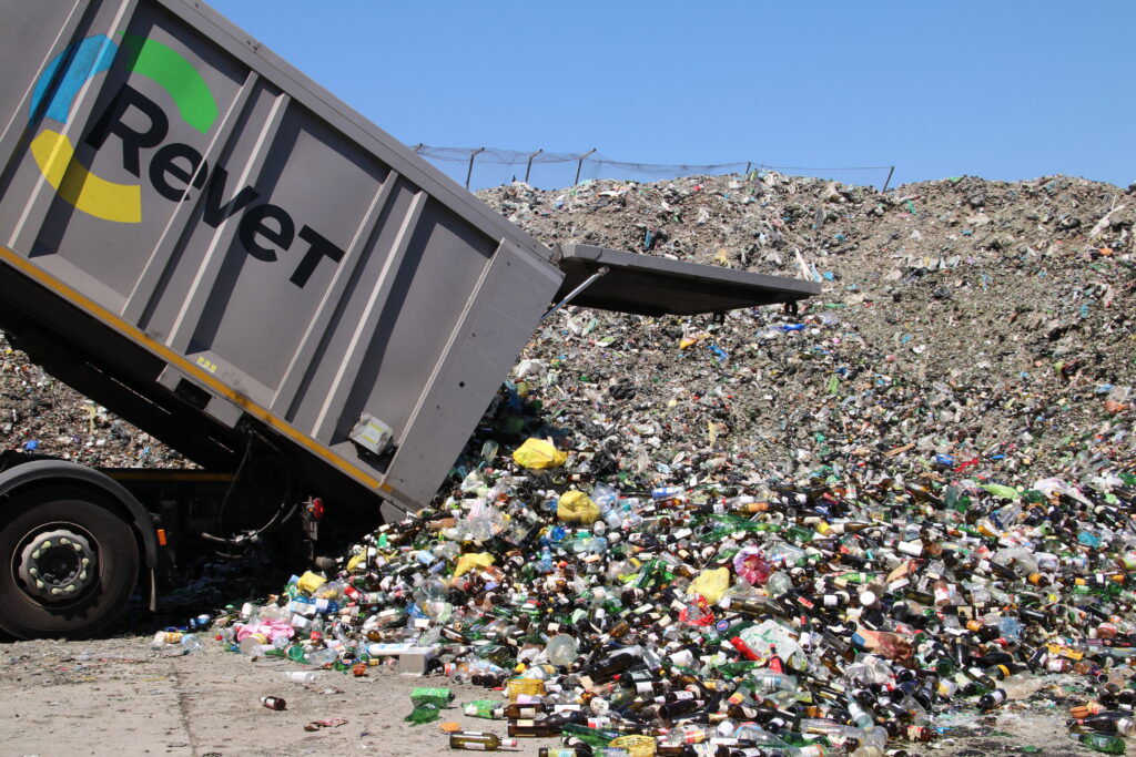 Tra gli enormi cumuli scaricati nell'impianto sono presenti però anche altri materiali, gettati insieme a bottiglie e vasetti. Tra questi si trovano alluminio, ferro, ceramica e altro che, insieme al vetro di scarto, vengono comunque recuperati e avviati a riciclo in altri impianti. Mentre il 4% finisce in discarica, circa l’82% è invece il vetro recuperato, il cosiddetto pronto forno misto verde, che torna in vetreria. "È uno dei pochi esempi in Italia di economia circolare reale" afferma Silvio Marano, direttore operativo di Vetro Revet, "la Revet si occupa della raccolta, noi ripuliamo, il vetro torna in vetreria". Selezionato tra tecnologia e a mano, ripulito e sminuzzato, il viaggio del vetro stavolta è breve: solo 1 km in linea d’aria e arriva alla seconda tappa, la Zignago Vetro, produttrice di bottiglie nel settore alimentare, beverage ma anche vasi destinati alla cosmesi.