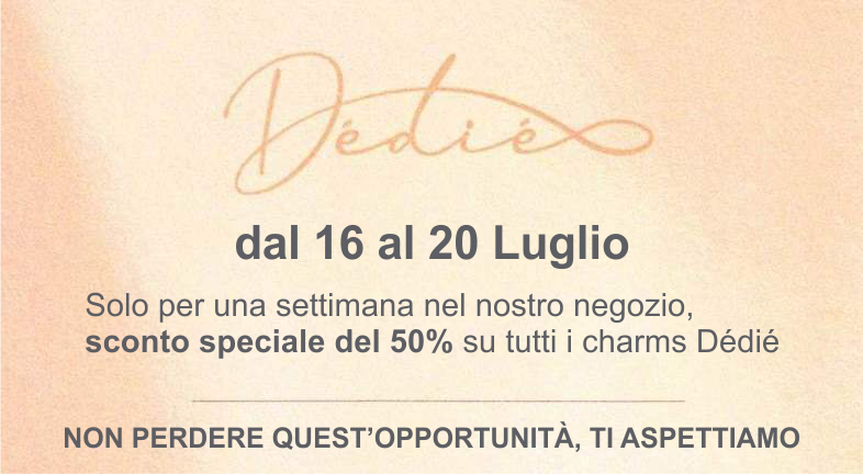 La Gioielleria Oreficeria Alino Mancini, concessionaria ufficiale dei bracciali Dédié, vi invita su appuntamento alla Dédié Week. E in aggiunta, solo in quella settimana, sarà effettuato uno sconto speciale del 50% su tutti i charms Dédié.
