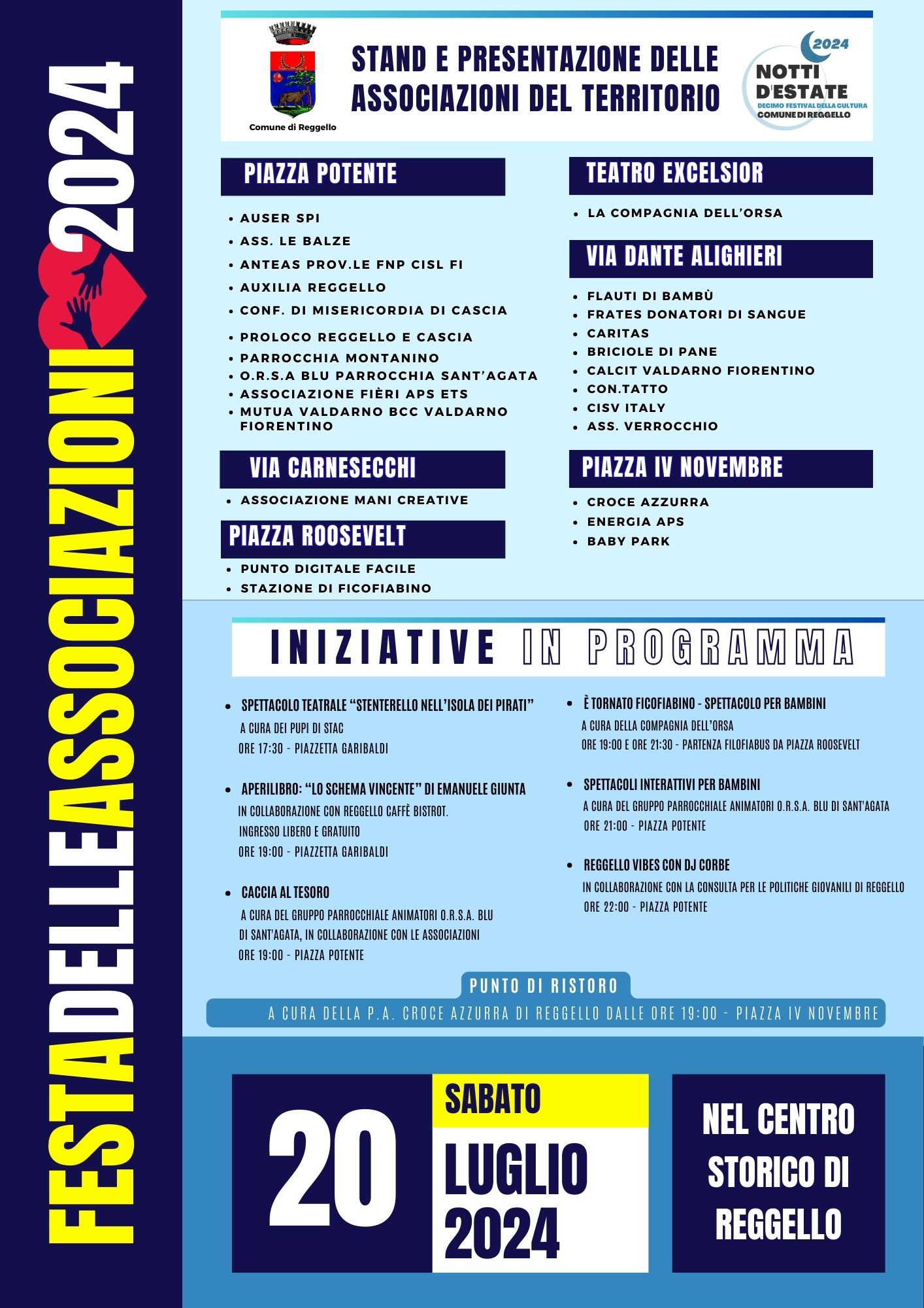 Torna l'appuntamento con la Festa delle Associazioni, che si terrà sabato 20 luglio nel centro storico di Reggello. Questo evento rappresenta un'occasione per scoprire e conoscere le numerose associazioni che operano sul territorio, contribuendo alla vita sociale, culturale e sportiva della nostra comunità.