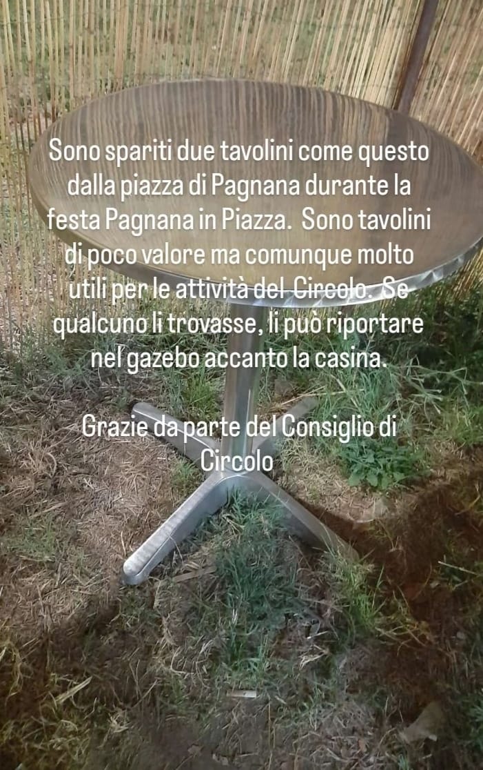 Ennesimo furto, di piccolo valore economico ma che porta con sè una grande delusione morale, in piazza Arno a Pagnana, Empoli. Sono spariti infatti due tavolini, comprati e messi gratuitamente a disposizione delle persone da “I gufi”, i volontari del Circolo Arci "Antonio Gramsci" che in estate gestiscono “La Casina”, il punto di ritrovo e ristoro situato in piazza.