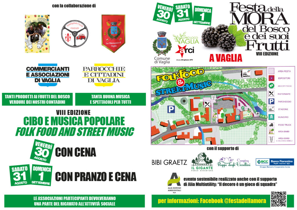 Venerdì 30, sabato 31 agosto e domenica 1° settembre 2024 il Comune di Vaglia in collaborazione con Pro Loco, Circolo Arci di Bivigliano, attività commerciali e associazioni di Vaglia organizzano l’ VIII edizione della FESTA DELLA MORA, DEL BOSCO E DEI SUOI FRUTTI A VAGLIA. Non solo more e appuntamenti gastronomici, ma anche street music & folk.
