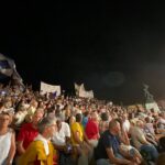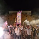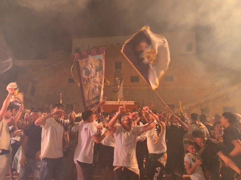 Alla fine, l’ora tarda, non stempera l’entusiasmo dei contradaioli di Porta Caracosta che alzano al cielo il drappo dipinto da Paola Imposimato.