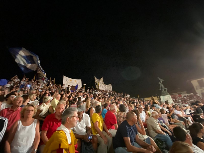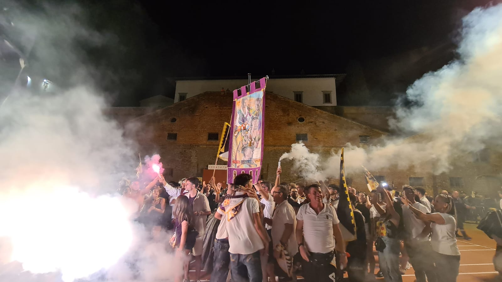 Alla fine, l’ora tarda, non stempera l’entusiasmo dei contradaioli di Porta Caracosta che alzano al cielo il drappo dipinto da Paola Imposimato.