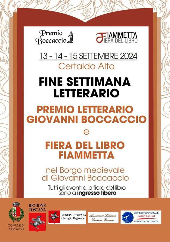 CERTALDO: gli stand degli editori arrivati a Certaldo da tutta Italia aprono al pubblico venerdì 13 settembre 2024 alle ore 11.00 nelle bellissime sale antiche di Palazzo Pretorio a Certaldo (FI). Sarà possibile incontrare gli editori, ma anche molti autori e illustratori per firmacopie e dediche personalizzate. La Fiera del Libro Fiammetta è ad ingresso gratuito dal 13 al 15 settembre 2024, orario 11.00-20.00.
