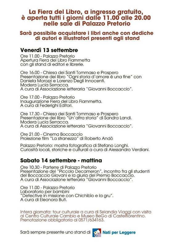 Ore 10.30 - Parterre di Palazzo Pretorio - Presentazione del “Piccolo Decameron” Federighi Editori, incontro fra gli studenti del Boccaccio Giovani e la giuria del Premio Boccaccio. A cura di Associazione letteraria “Giovanni Boccaccio”.