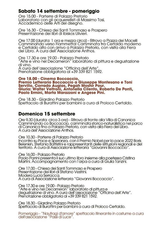 Ore 10.30 - Parterre di Palazzo Pretorio - Incontro su Pace e Speranza, con il Premio Nobel per la pace 2022 Boris Belenkin, Stefania Battistini e rappresentanti delle istituzioni regionali e del territorio. A cura di Associazione letteraria “Giovanni Boccaccio”.