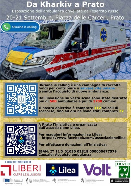 L’ambulanza sarà esposta il 20 e il 21 settembre in piazza delle Carceri e si collega alla campagna di raccolta fondi “Ukraine is calling”, mirata all'acquisto di nuove ambulanze. “Dall'invasione su vasta scala sono state distrutte più di 500 ambulanze e più di 1700 camion. Il nostro obiettivo è comprare 112 veicoli di soccorso, fino ad ora ne sono stati comprati 72” spiegano gli organizzatori della campagna.