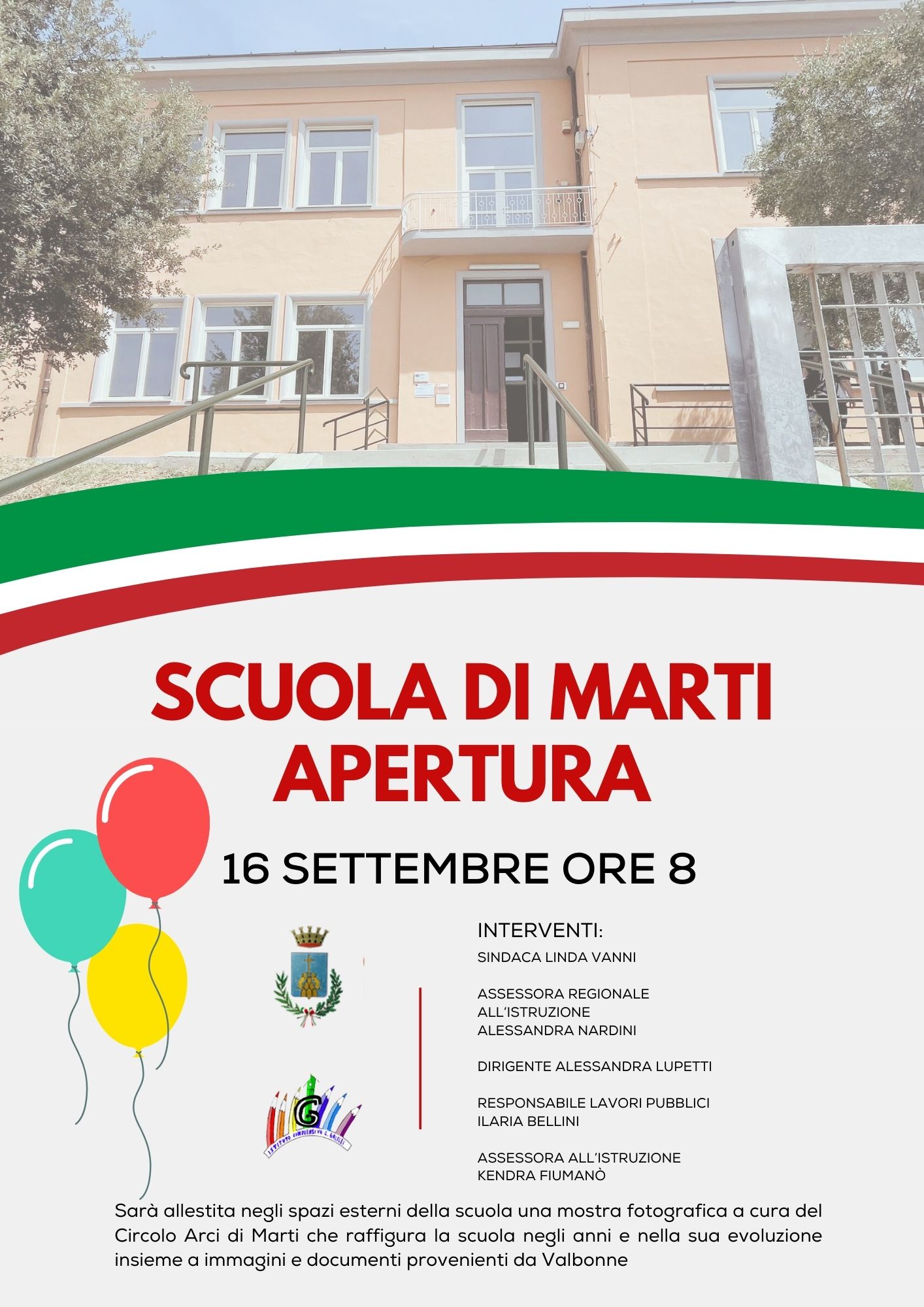 Al via al nuovo anno scolastico nella scuola rinnovata. L'appuntamento con la prima campanella è a Marti dove la struttura, lunedì 16 settembre alle ore 8, riaprirà dopo gli ingenti lavori di ristrutturazione. Prima dell'inizio delle lezioni ci sarà il taglio del nastro: previsti gli interventi della sindaca di Montopoli in Val d'Arno Linda Vanni, dell'assessora regionale all'istruzione Alessandra Nardini, della dirigente scolastica Alessandra Lupetti, della responsabile ai lavori pubblici Ilaria Bellini e dell'assessora all'istruzione Kendra Fiumanò.