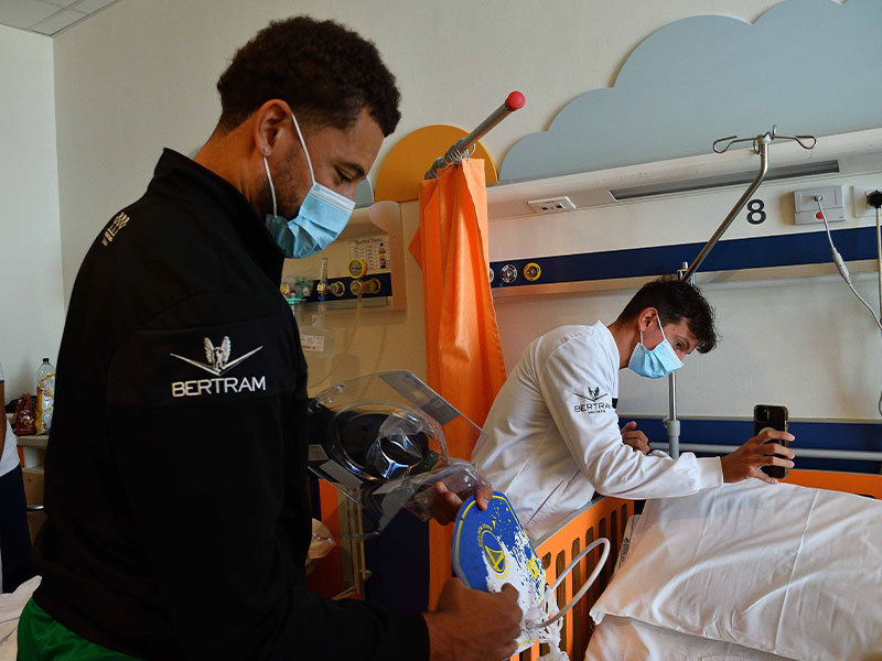 Durante la visita i giocatori hanno salutato i giovani pazienti e si sono fermati a parlare con loro distribuendo gadget e regali messi a disposizione dalle squadre e dall’organizzazione del torneo.