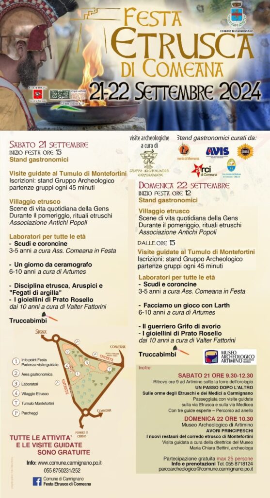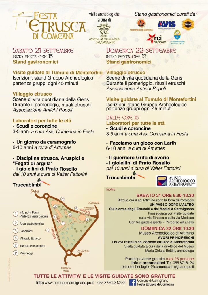 Il programma. Sabato 21 settembre, area tumulo di Montefortini: dalle ore 15.00, ogni 45 minuti, visite guidate di gruppo al sepolcro principesco a cura del Gruppo archeologico Carmignanese, che nel suo stand raccoglie anche le iscrizioni; il villaggio etrusco con scene di vita quotidiana della gens etrusca e rituali etruschi a cura dell’associazione Antichi Popoli; dalle ore 16 laboratori per tutte le età: "Scudi e coroncine" 3-5 anni a cura di Comeana in Festa, "Un giorno da ceramografo" 6-10 anni a cura di Artumes, "Disciplina etrusca, aruspici” e "Fegati di argilla" dai 10 anni a cura di Valter Fattorini, "I gioiellini di Prato Rosello" dai 10 anni a cura di Valter Fattorini, il tutto con la possibilità di truccare gratuitamente i bambini.