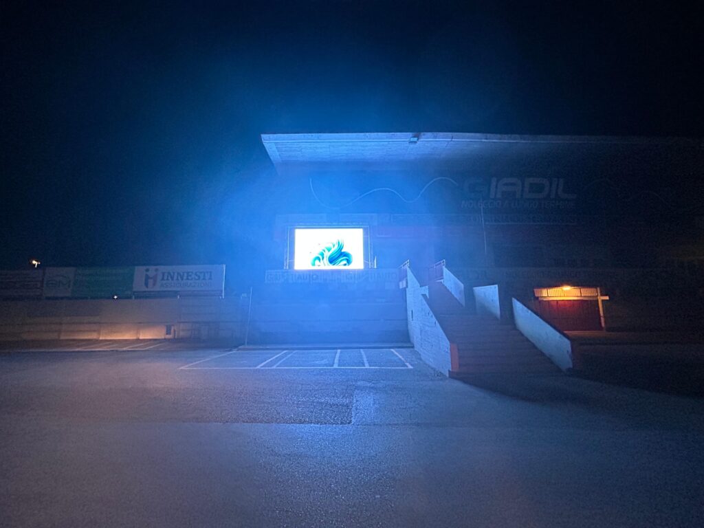 Di cosa stiamo parlando? Di un maxi-schermo a led, pubblicitario, appeso da oltre un anno alla tribuna centrale dello stadio Mannucci. Lo schermo spesso non trasmette pubblicità ma è settato su un normale desktop di un computer, da cui parte, fortissima, la luce azzurra.