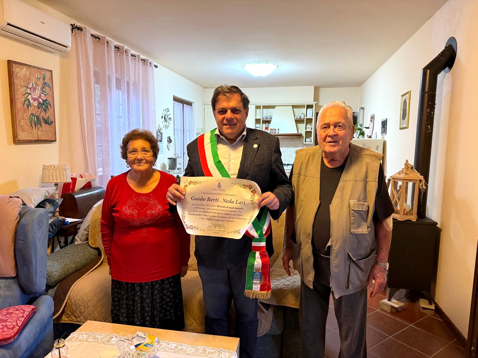 Nozze di diamante a Valdicastello Carducci. Il sindaco di Pietrasanta Alberto Stefano Giovannetti ha voluto celebrare i sessant’anni insieme di Guido Berti e Neda Lari con una pergamena istituzionale, consegnata ai due coniugi giovedì pomeriggio. A Guido e Neda le felicitazioni di tutta l’amministrazione e la comunità cittadina.