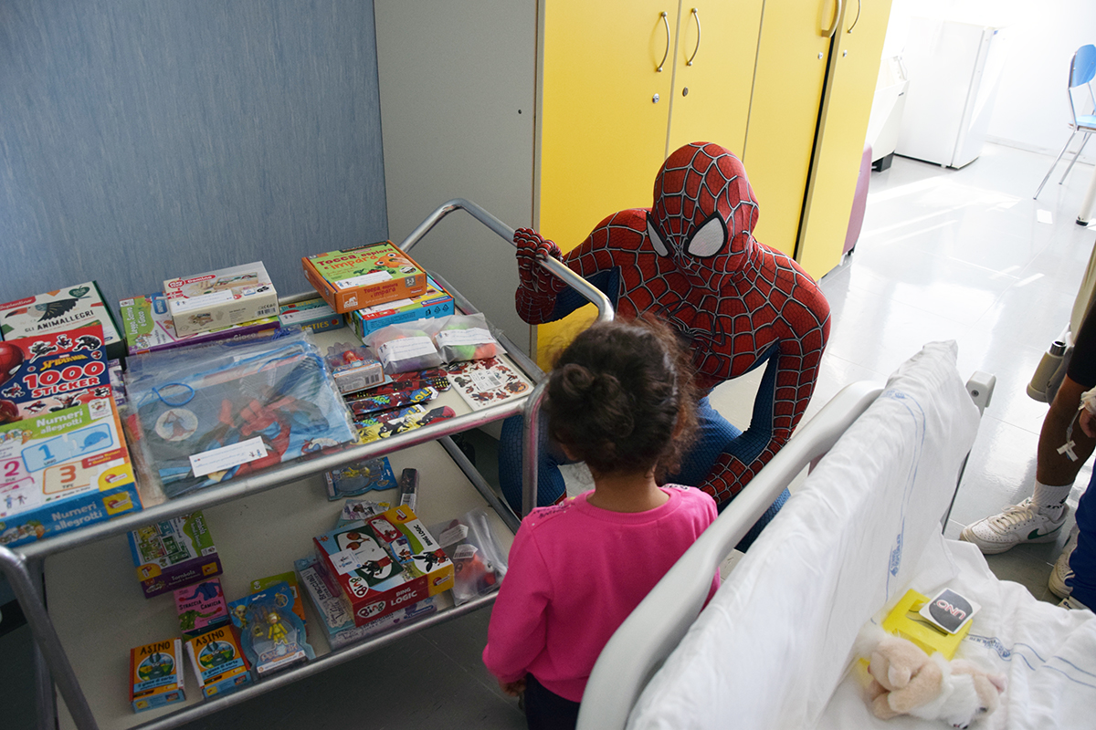 Il "supereroe di corsia" è tornato a portare il suo carico di gioia e spensieratezza ai piccoli pazienti