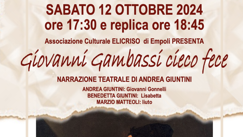 Sabato 12 ottobre ore 17:30 e replica ore 18:45 Associazione Culturale Elicriso di Empoli presenta 'Giovanni Gambassi cieco fece'. Si tratta di una narrazione teatrale di Andrea Giuntini, che interpreta Giovanni Gonnelli, con Benedetta Giuntini nei panni di Lisabetta e Marzio Matteoli al liuto.