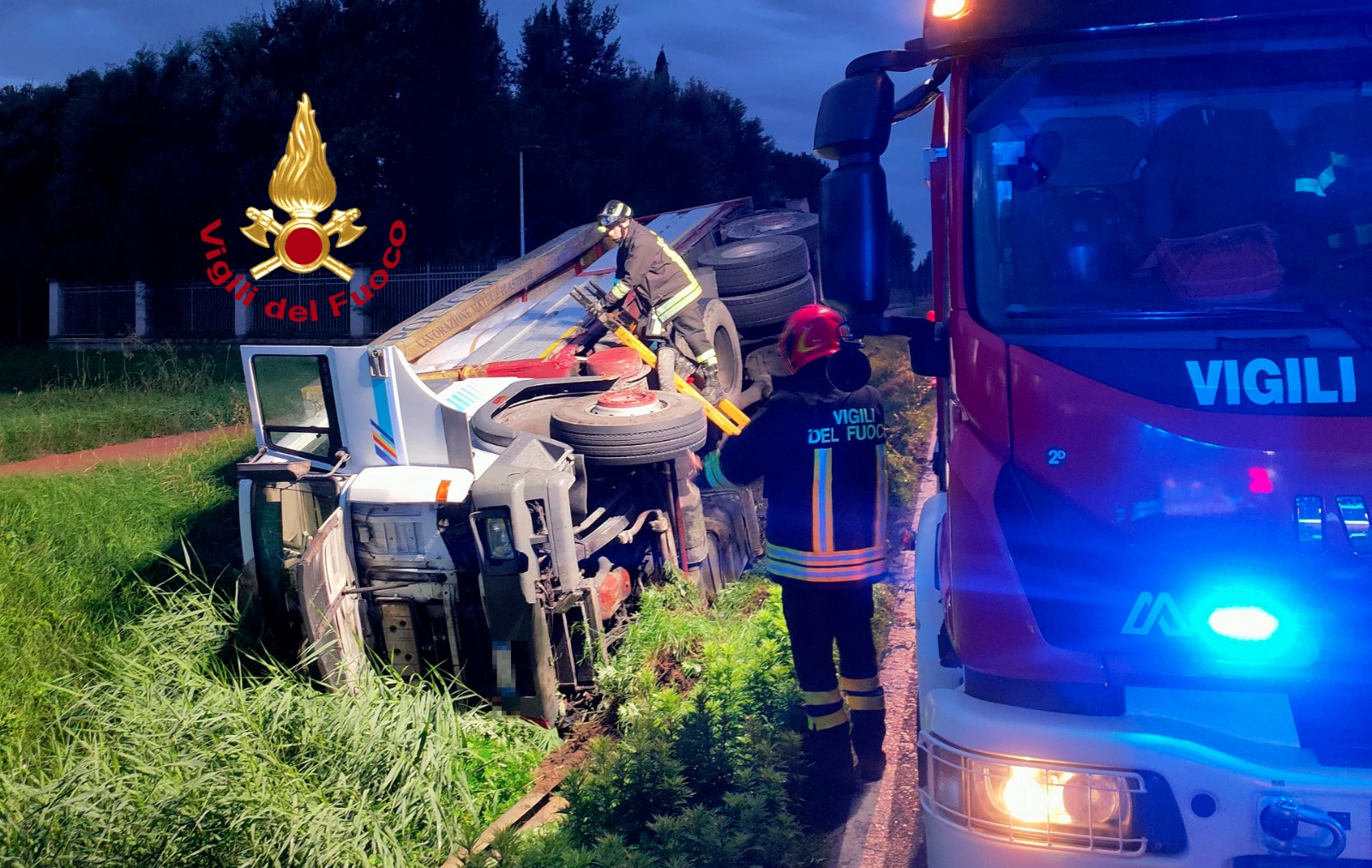 Incidente alle prime ore di questa mattina in via Pistoiese, a Fucecchio. A rimanere coinvolto un solo mezzo pesante che, uscendo dalla carreggiata, si è ribaltato su un fianco. Sul posto, alle 6.35, sono intervenuti i vigili del fuoco di Empoli che hanno soccorso il conducente, rimasto illeso e per il quale non è stato necessario l'intervento dei sanitari. Il mezzo, che trasportava granelli di plastica per termo stampe, è stato infine messo in sicurezza.