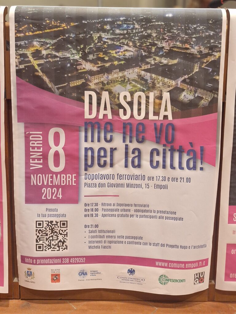 Quest'anno 'Donne al Centro. Eventi di ogni Genere' sarà arricchito da un nuovo progetto, 'Da sola me ne vo per la città', un evento promosso dal Comune di Empoli, dalla fondazione HUGO ( Human Geography Organizer) e Sociolab. Il nuovo format prevede tre passeggiate a cui sarà possibile parteciparvi tramite prenotazione sul sito del Comune, che coinvolgeranno quelle zone ritenute 'insicure' da parte delle donne. Le passeggiate si svolgeranno in via XI Febbraio e vie limitrofe (via Amendola, via delle Fiascaie, piazza Gramsci, piazza della Vittoria, via Curtatone e Montanara), nel centro storico (via Roma, via Ridolfi, piazza Guido Guerra, piazza Matteotti, via Chiara, via della Noce, piazza Farinata degli Uberti, via dei Neri, via Ridolfi, piazza Matteotti) e attraverso il sottopasso ferroviario per poi proseguire su via Cantini, via dei Cappuccini, viale IV Novembre, parco delle Cascine, viale Buozzi e parco della Rimembranza, via Fabiani e via Verdi.