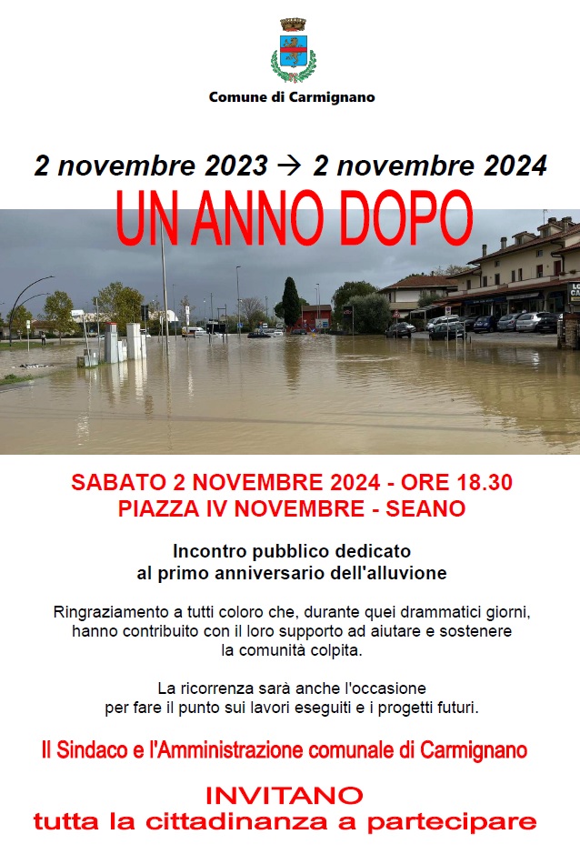 “Un anno dopo”, il Comune di Carmignano, sindaco Edoardo Prestanti in testa, a dodici mesi esatti dall’alluvione del 2 novembre 2023, torna a Seano, che fu investita dalla piena del torrente Furba, per ringraziare in piazza IV Novembre, sabato 2 novembre prossimo, alle ore 18.30, “tutti coloro che, durante quei drammatici giorni, hanno contribuito con il loro supporto ad aiutare e sostenere le comunità colpite”.