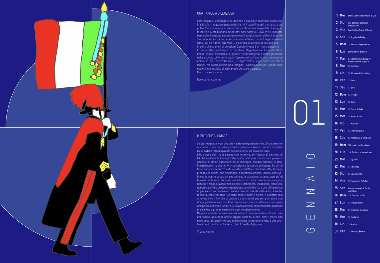 Realizzato con il contributo di Marco Lodola e Maurizio de Giovanni, le 12 tavole del calendario descrivono un dialogo tra un maresciallo e suo figlio