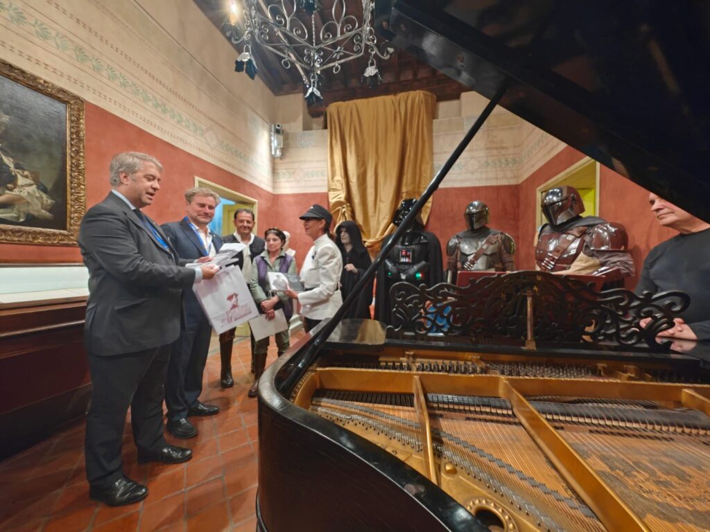 Il tema della famosissima colonna sonora della saga cinematografica contiene infatti una significativa similitudine con un’armonia del finale dell’intermezzo orchestrale della Manon Lescaut, una somiglianza ormai conosciuta da molti appassionati e musicologi. Ad accogliere i gruppi di Star Wars il sindaco di Lucca Mario Pardini – presidente della Fondazione Giacomo Puccini - che ha ascoltato assieme a tutti gli intervenuti le note del tema comune suonate al pianoforte di Puccini dal maestro Massimo Morelli.