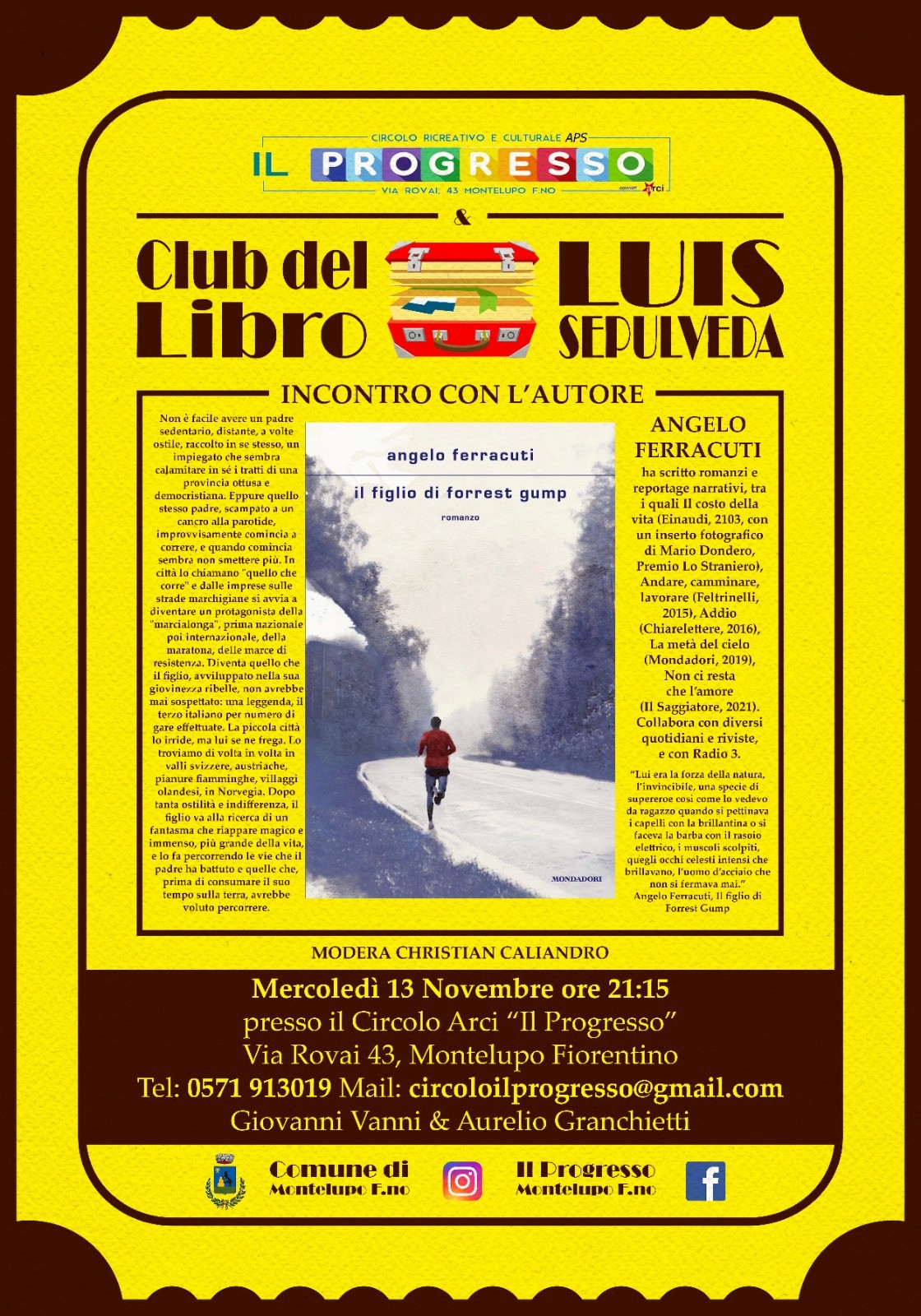 Torna l'appuntamento con l'autore al club del libro Luis Sepulveda. Domani mercoledì 13 Novembre al Circolo Il Progresso di Montelupo arriva l'autore Angelo Ferracuti con il suo Figlio di Forrest Gump appena uscito in libreria. Con Christian Caliandro a fare da moderatore. Un libro autobiografico che affronta il tema del rapporto padre figlio e la famiglia. L'evento sarà alle 21.15.