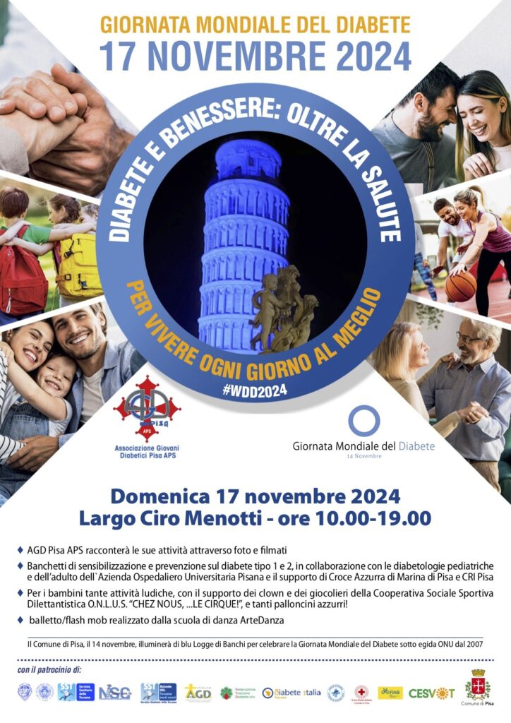 · Dalle 10: due banchetti informativi; uno focalizzato sul diabete di tipo 1 nei bambini e ragazzi, gestito da Agd-Associazione giovani diabetici Pisa APS, e l’altro sul diabete di tipo 2, coordinato dall’Unità operativa di Malattie metaboliche e diabetologia dell'Azienda ospedaliero-universitaria pisana e il supporto della Croce azzurra di Marina di Pisa e della Croce rossa italiana di Pisa.