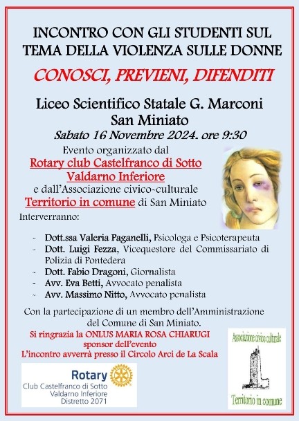 In particolare, domani, presso il liceo Scientifico Marconi di San Miniato, con la partecipazione degli studenti, organizzato dal Rotary Club di Castelfranco di Sotto Valdarno Inferiore si terrà un convegno sul tema.