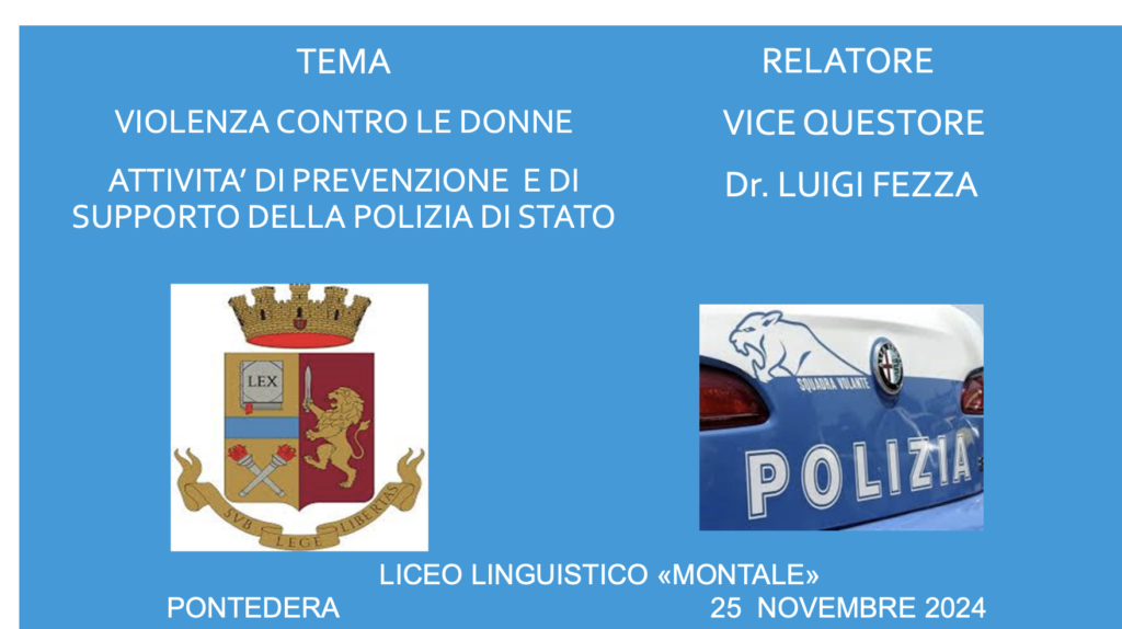 Il giorno 25 novembre, presso il liceo Linguistico, Umanistico e Economico-Sociale “Montale” di Pontedera, sono stati previsti alcuni incontri con le classi del triennio sul tema “Violenza sulle donne- Attività di prevenzione e di supporto della Polizia di Stato”.