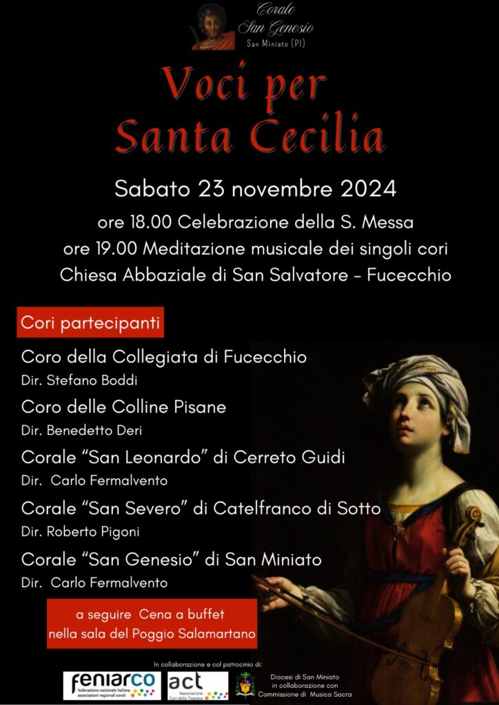 Sabato 23 Novembre 2024 nella Chiesa Abbaziale di San Salvatore a Fucecchio, cinque cori della Diocesi si riuniranno per celebrare la Festa di Santa Cecilia, patrona della Musica Sacra e di quanti svolgono un ministero musicale nella liturgia. L'evento organizzato dal Corale San Genesio della Diocesi di San Miniato in collaborazione con la Commissione Diocesana di Musica Sacra, prevede la celebrazione della Messa alle ore 18.00 alla quale parteciperanno i cori riuniti e a seguire un omaggio musicale dei singoli gruppi corali partecipanti. La serata fa parte dell'evento nazionale "Voci per Santa Cecilia" promosso da FENIARCO e dell'Associazione cori della Toscana.