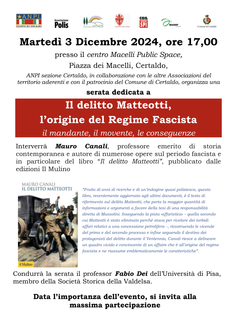 ANPI Certaldo, con numerose altre associazioni del territorio e con il patrocinio del Comune di Certaldo, ha organizzato un incontro dedicato al "Delitto Matteotti, l’origine del Regime Fascista. Il mandante, il movente, le conseguenze". L'incontro si terrà il 3 dicembre, alle ore 17, presso il centro Macelli Public Space, Piazza dei Macelli, Certaldo, con l'intervento di Mauro Canali, professore emerito di storia contemporanea e autore di numerose opere sul periodo fascista e in particolare del libro "Il delitto Matteotti", pubblicato dalle edizioni Il Mulino e recentemente aggiornato. Condurrà la serata il professor Fabio Dei dell’Università di Pisa, membro della Società Storica della Valdelsa. Altre informazioni nella locandina.