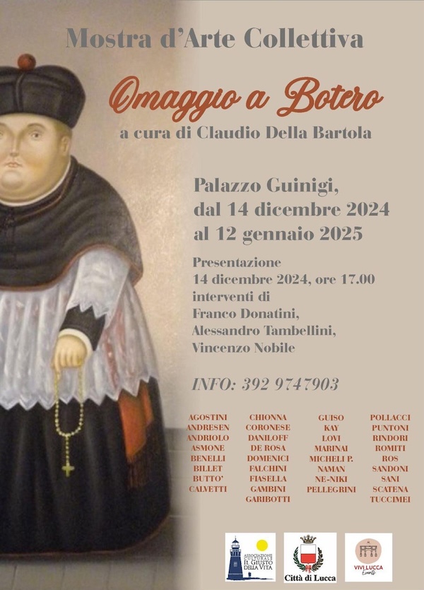 Oggi 14 dicembre, alle ore 17 Palazzo Guinigi a Lucca ospiterà il vernissage della mostra "Omaggio a Botero", un evento che celebra il celebre pittore colombiano Fernando Botero e la sua inconfondibile visione dell'arte, caratterizzata da forme rotonde e volumi generosi. La mostra, che si inserisce nel programma di eventi culturali del Comune di Lucca, vedrà la partecipazione di numerosi artisti contemporanei, tra cui la pittrice russa Yana Ros, che esporrà una sua opera ispirata proprio allo stile di Botero. Sarà possibile visitarla fino al 12 gennaio 2025.