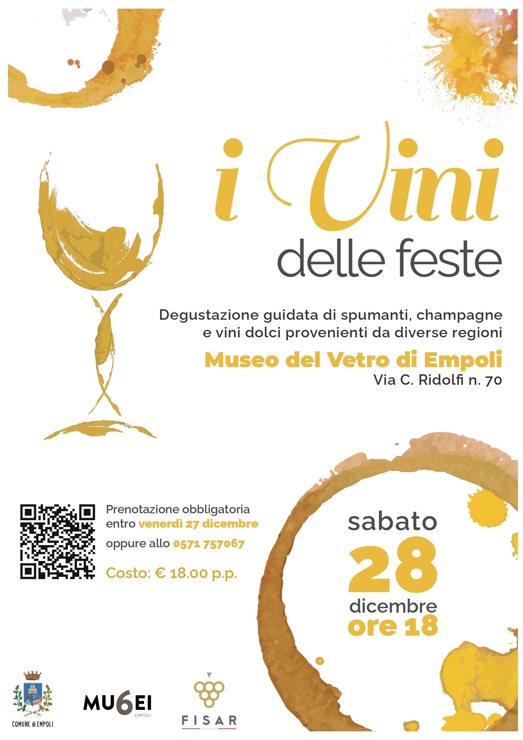 L’appuntamento è riservato ad un pubblico di sole 50 persone e ha un costo di 18 euro a persona. Visti i posti limitati, la prenotazione è obbligatoria, da effettuarsi direttamente sul sito di Fisar Empoli al link https://www.fisarempoli.it/evento/dettaglio/116-i-vini-delle-feste