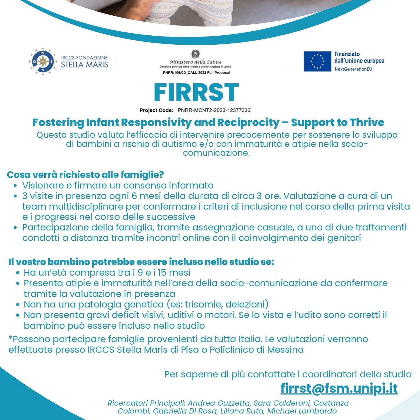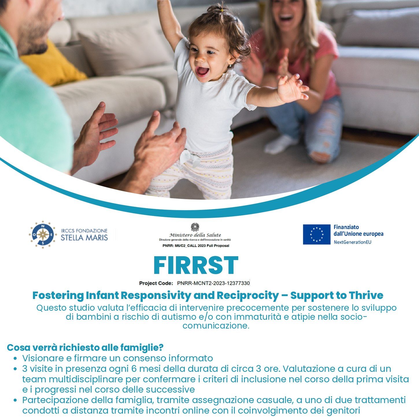 L’IRCCS Fondazione Stella Maris ha avviato l'innovativo studio europeo "FIRRST (Fostering Infant Responsivity and Reciprocity – Support to Thrive)", dedicato ai bambini di età compresa tra 9 e 15 mesi che mostrano segnali iniziali di Disturbo dello Spettro Autistico (ASD). Grazie ai finanziamenti del PNRR del Ministero della Salute e al supporto dell’Unione Europea, questo progetto rappresenta una svolta nella ricerca sull’intervento precoce per l’autismo. Lo studio è condotto dall'IRCCS Fondazione Stella Maris, con la partecipazione di esperti come il Prof. Andrea Guzzetta, la Dr.ssa Sara Calderoni e la Dr.ssa Costanza Colombi.