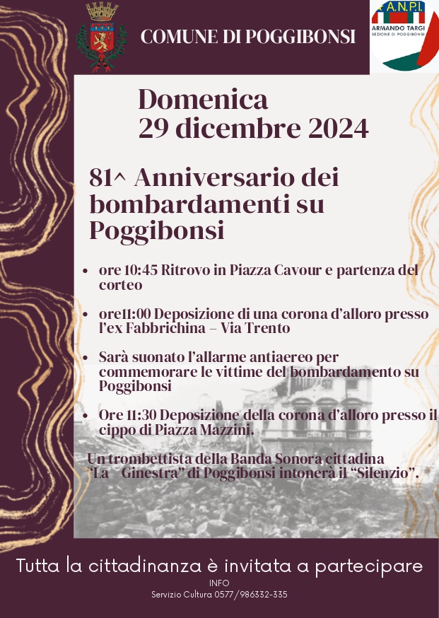 “Ricordare è un dovere morale nei confronti di chi ha perso la vita, gli affetti, tutto ciò che aveva e nei confronti di chi patisce oggi gli stessi drammi, la stessa ingiustizia, la stessa paura - dice la sindaca Susanna Cenni – La nostra città ha una storia di impegno civico e democratico, segnata dalla guerra e dalla distruzione ma anche dalla ricostruzione e dalla capacità che i Poggibonsesi hanno avuto di rimboccarsi le maniche. Purtroppo oggi, mentre ricordiamo la distruzione della nostra città, abbiamo davanti a noi altre immagini di distruzioni, di Gaza, dell’Ucraina. Ecco, aver cura della nostra memoria significa ricordare le nostre radici e il nostro costante impegno per la pace e la democrazia”.