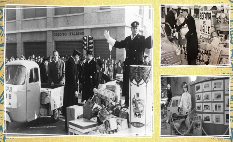 La “Rievocazione della Befana del Vigile Urbano e del Vespa Club” è una tradizione che risale agli anni ‘50 quando si diffuse l’usanza di recarsi presso le postazioni dei Vigili Urbani, collocate al centro degli incroci nei punti importanti delle città, per portare loro dei doni. Questa tradizione aveva un doppio significato: quello di riconoscenza per il lavoro svolto dai Vigili urbani in città e quello della solidarietà verso le persone meno abbienti. Nei giorni successivi, infatti, una parte dei doni ricevuti dalla popolazione veniva devoluta a scopo benefico dai Vigili urbani.