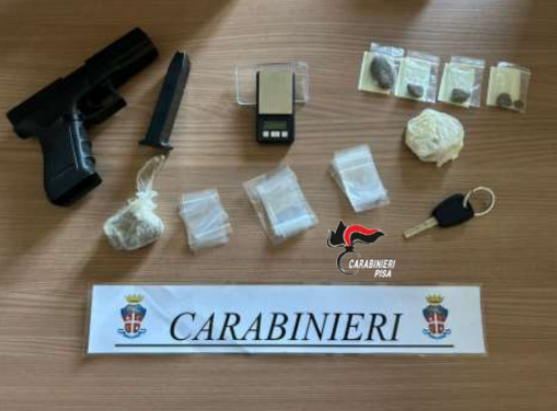 Durante la perquisizione, i militari hanno sequestrato l’arma utilizzata, una pistola scacciacani 8mm marca Bbm mod. Gapkal priva di tappo rosso con caricatore contenente 5 cartucce a salve (di cui una già esplosa), occultata nella tasca frontale del giubbotto dell'arrestato, 40 grammi di hashish suddivisi in dosi, materiale per il confezionamento della droga e una bilancia di precisione.