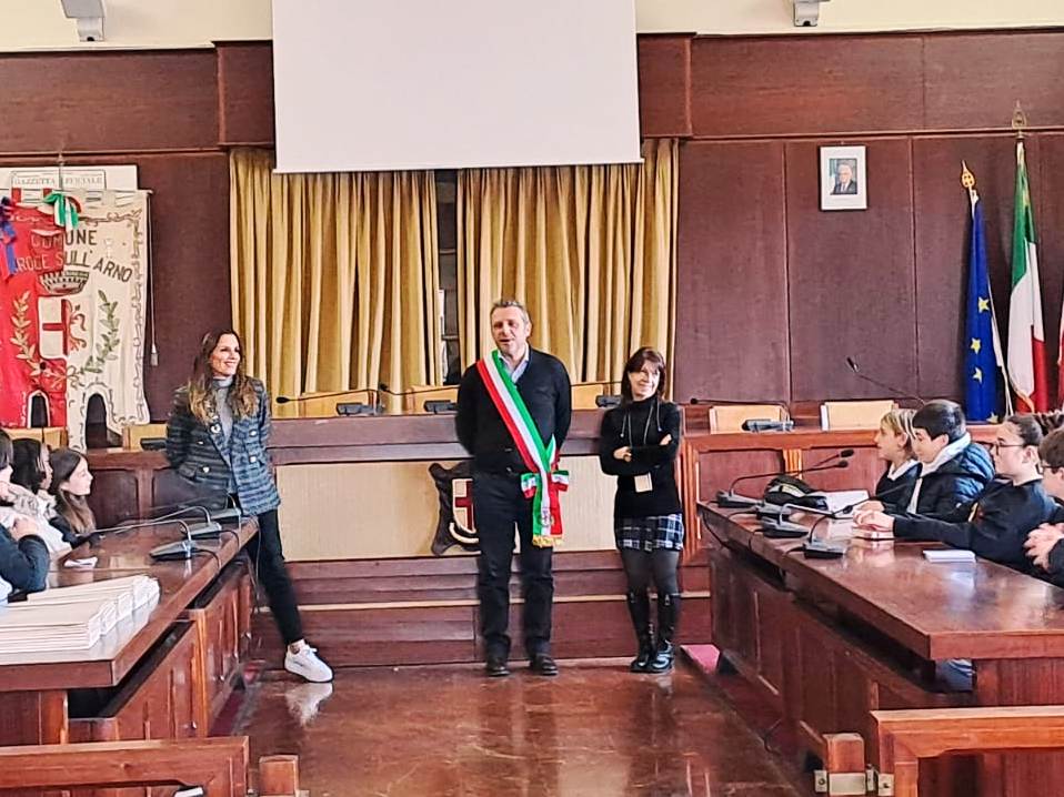 Sono 42 i ragazzi che questa mattina (16 gennaio), sono arrivati in comune a Santa Croce sull'Arno per prendere parte al progetto “Tutti in comune, un comune per tutti” ideato dall'assessore alle politiche educative Valentina Fanella. Si tratta di un percorso di educazione civica che punta a rendere i cittadini di domani persone attive nella vita della comunità e il primo passo è proprio quello di conoscere come funzionano gli enti più vicini al cittadino a cominciare dal municipio. Questa mattina i rappresentanti delle classi della scuola secondaria di primo grado di Santa Croce sull'Arno e Staffoli, con i loro docenti hanno incontrato l'assessore Fanella e il sindaco Roberto Giannoni nel palazzo municipale. Insieme hanno fatto i saluti istituzionali nella sala del consiglio comunale, illustrando loro quello che accade in quell'aula e soprattutto l'importanza del consiglio comunale.