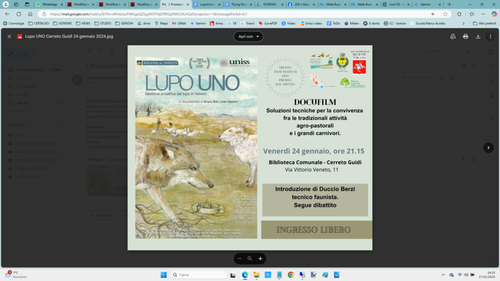 Venerdì 24 gennaio (alle ore 21.00, presso la biblioteca comunale) sarà la volta di Cerreto Guidi. Lo faremo attraverso la proiezione del docufilm “LupoUno”, cui seguirà un dibattito con il Dr. Duccio Berzi, uno dei massimi esperti italiani di strategie di convivenza fra grandi carnivori e attività umane.
