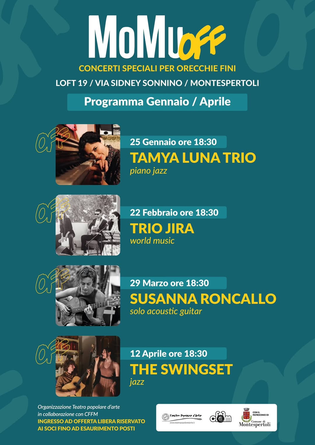 “Siamo entusiasti di presentare questa nuova edizione di MoMuOFF: concerti speciali per orecchie fini, un appuntamento che, anno dopo anno, si conferma come un punto di riferimento per gli amanti della musica dal vivo qui a Montespertoli. Il nostro obiettivo è quello di creare momenti unici in cui il pubblico possa immergersi in un’esperienza musicale di qualità, scoprendo artisti talentuosi e sonorità che spaziano tra generi e culture. Ringrazio il Teatro Popolare d’Arte e il Circolo Fotografico Fermoimmagine che hanno collaborato con entusiasmo per rendere possibile questa rassegna. Vi invitiamo a partecipare numerosi, perché ogni concerto è un piccolo viaggio, un’occasione per emozionarsi e condividere insieme la bellezza della musica. Montespertoli continua così a dimostrarsi un territorio aperto alla cultura, capace di unire tradizione e innovazione, con una proposta sempre più ricca e variegata.” ha dichiarato Alessandra De Toffoli, Assessore alla Cultura del Comune di Montespertoli.
