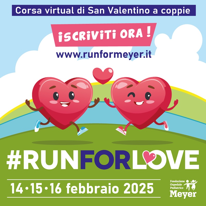 Torna anche per il 2025 la corsa di San Valentino organizzata dalla Fondazione Meyer: i proventi delle iscrizioni verranno, anche stavolta, destinati al sostegno del progetto Play Therapy a favore dei piccoli pazienti del nostro ospedale. La formula è sempre la stessa, in modalità virtual: si corre dove si vuole, con chi si vuole, quando si vuole nei giorni compresi tra venerdì 14 e domenica 16 febbraio 2025. L'importante è farlo in coppia o con la persona alla quale si vuole più bene. Quindi via libera a tutti gli "amori": quello tra migliori amici, tra compagni di allenamento, tra colleghi, nipoti e zii, coniugi, fidanzati. Dopo il rosa dello scorso anno, la novità per questa edizione 2025 è il giallo fluo che caratterizza la t- shirt tecnica, sempre offerta da Guess Foundation. Per chi lo volesse, è possibile richiedere anche un comodo scaldacollo tecnico personalizzato Runformeyer. Questa iniziativa solidaristica è cresciuta negli anni: nel 2024 ha registrato 3568 partecipanti, con un incremento del 50% rispetto all’anno precedente.