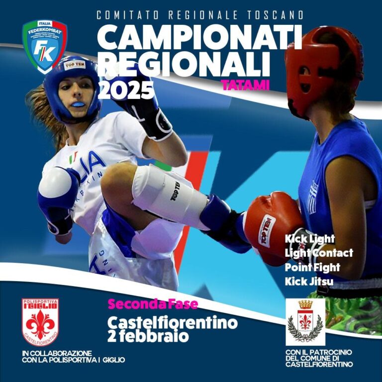 Organizzato dalla FederCombat CONI (federazione regionale toscana) in collaborazione con la Polisportiva I’ Giglio e il patrocinio del Comune di Castelfiorentino, le gare inizieranno alle ore 10.30, per poi proseguire anche nel pomeriggio fino alle ore 19.00 circa. A contendersi il podio centinaia di atleti provenienti da tutta la Toscana, che si affronteranno in quattro diverse specialità: light contact, point fighting, kick light. Kick Jitsu. Gli incontri si svolgeranno a “contatto leggero”, con l’uso del tappeto (a differenza del ring, che è a “contatto pieno”).