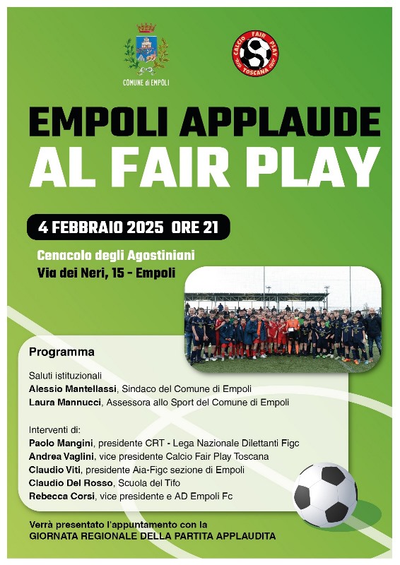 Presentato qualche settimana fa, siamo davvero a pochi giorni dall’evento. Una iniziativa che per la prima volta arriva in città. Martedì 4 febbraio 2025, alle 21, nel Cenacolo degli Agostiniani, in via dei Neri, 15, si terrà il convegno 'Empoli applaude al Fair Play' ad ingresso libero. Un’occasione importante per riflettere su come riportare il calcio sui binari di un tifo sano, corretto, rispettoso dei valori sportivi e delle persone che lo praticano e più in generale delle tematiche legate al Fair Play in ambito di calcio giovanile.