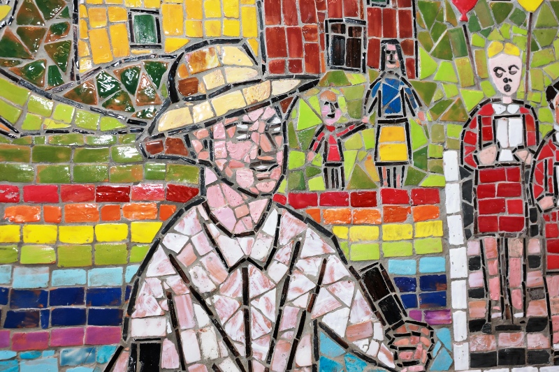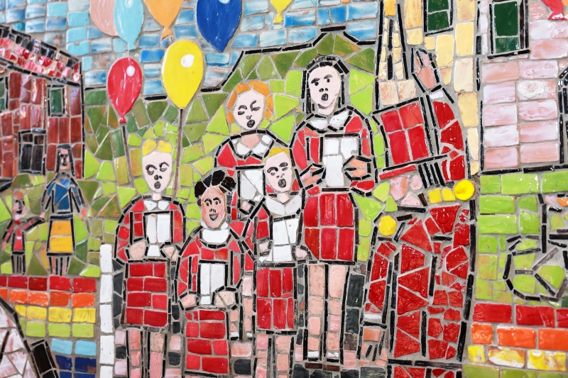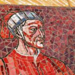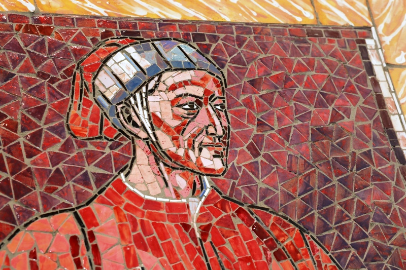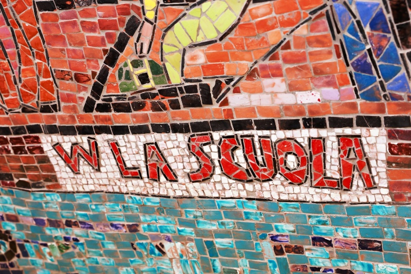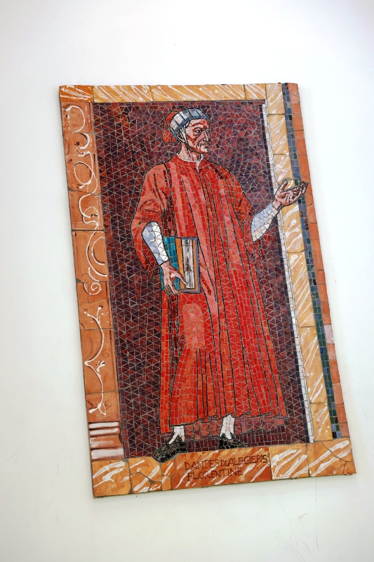 I due mosaici raffigurano, in due scene separate, Dante Alighieri, il poeta padre della lingua italiana a cui la scuola è intitolata, e una rappresentazione del mondo della scuola in chiave allegorica, come una barca che permette di approdare verso nuovi lidi lungo le acque della conoscenza.